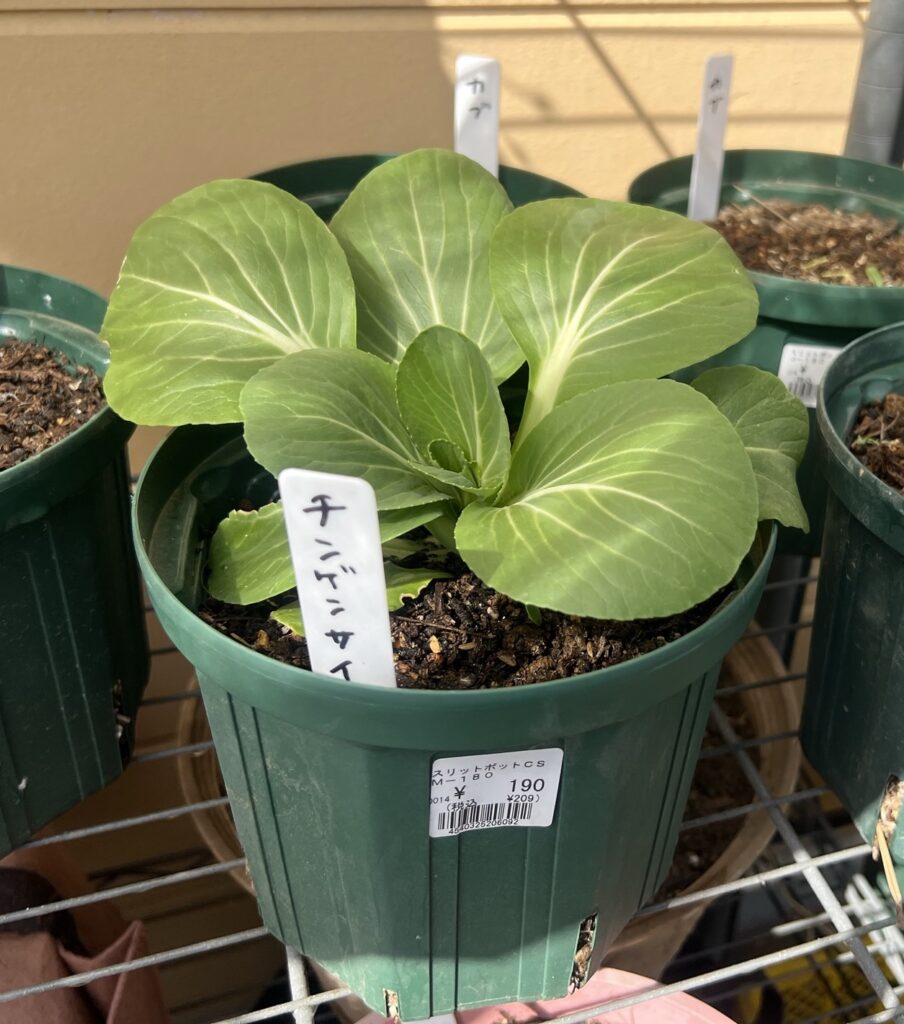 チンゲンサイは耐寒性も強く、育て易いです。こちらの緑陽という品種は小サイズから大サイズまで幅広く育てられます。