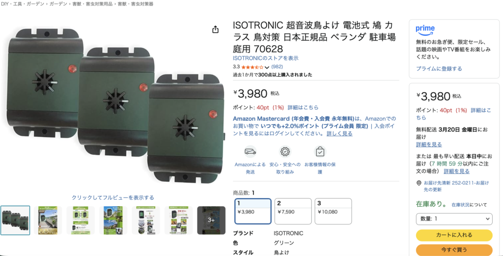 超音波を発して、鳥が居づらくなる環境を作る商品です。お値段も3,980円と高くはなかったので購入してみました。