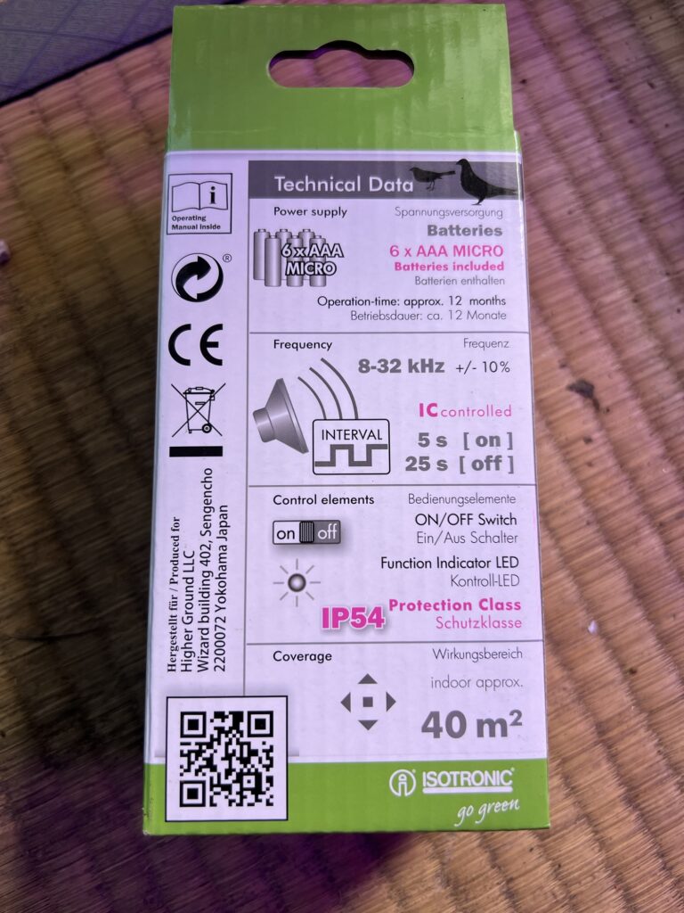 そんな中、音で忌避効果を得られるとの情報があり、こちらの商品を購入してみました。
