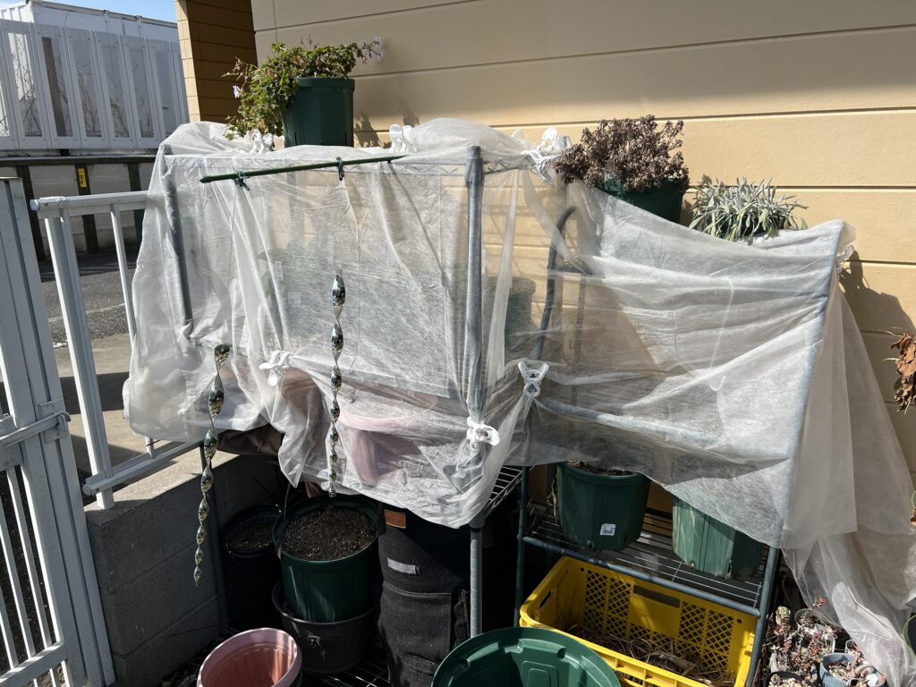 試行錯誤のうえ、小さい鉢はこのような感じで不織布を巻いて、物理的に防御してました。被害はなくなり、寒さ対策もできてホクホクしていました。